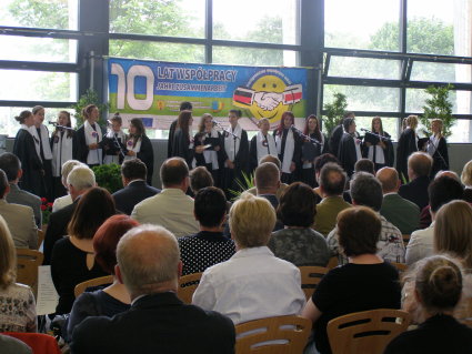 deutsche und 20 polnische Schüler sangen in einem Flugzeughangar in Rogowo genau