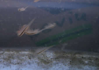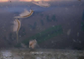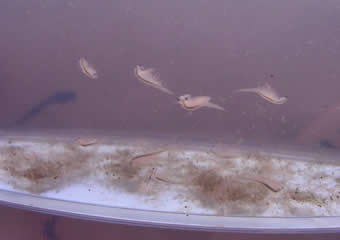 3. Schritt: Aquarienpflege: - täglich mit der Pipette Luft ins Becken pusten; Unsere Nauplien haben sich teilweise in Krebschen verwandelt. Doch nun haben wir 2 Wochen Winterferien. Florian nimmt ein Aquarium mit nach Hause. Wir sind schon gespannt, ob unsere Krebschen bis nach den Ferien überleben. Die Larven und Krebschen des 2. Aquariums haben wir den Fischen in unserem Schulaquarium als Frischfutter gegeben. Die Fische waren begeistert, wir weniger! |